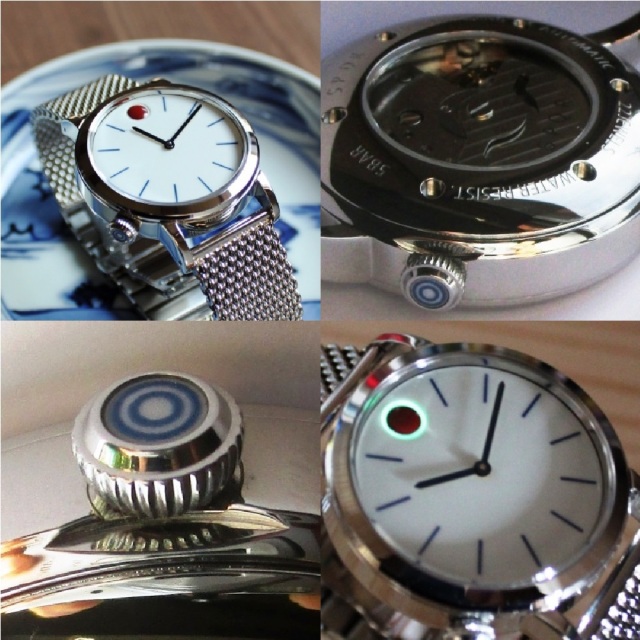 文字盤の12時には伝統工芸師である木曽漆の荻上文峰氏の手による 「日の本」 を象徴する朱漆を外周から根本夜光が浮かび上がらせます。 操作性の高いたまねぎ型りゅうずのトップには日本の伝統である蛇の目模様の白磁を埋め込んでいます。