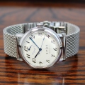 世界的にも希少なパワーリザーブ機能を搭載!残りの駆動時間をインジケーターで表示します。電池交換が不要で、動力を与える限り半永久的に動き続けます。文字盤はアイボリーとブラックベースに肉厚アラビア印刷とバーインデックス。針のカラーリングはブルーで統一し、光の屈折により深いメタリックブルーの色合いが変化します。3.4mm厚のドイツSTIB社のステンレス製メッシュバンドは、高いクオlリティを実感できます。