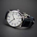バンドは グレージング仕上げの紺クロコダイルです。 革の劣化を防止すると同時に腕からの落下を防止する為、堅牢で重厚なステンレス材のプッシュ式3つ折れ中留を装備しました。