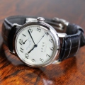 世界的にも希少なパワーリザーブ機能を搭載!残りの駆動時間をインジケーターで表示します。電池交換が不要で、動力を与える限り半永久的に動き続けます。文字盤はアイボリーとブラックベースに肉厚アラビア印刷とバーインデックス。針のカラーリングはブルーで統一し、光の屈折により深いメタリックブルーの色合いが変化します。。4mm厚の最高級クロコダイル革を使った濃紺オイルマット仕上げのバンドは、使うほどに風合いが増します。